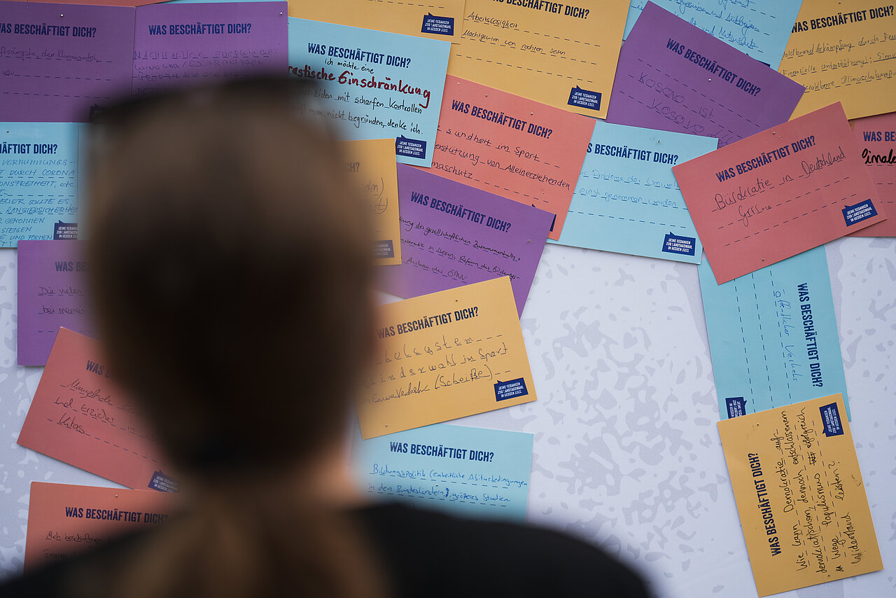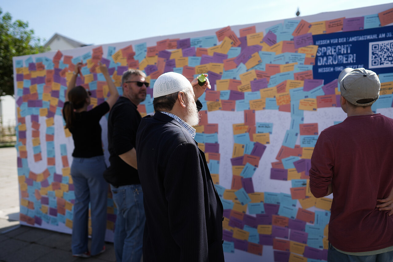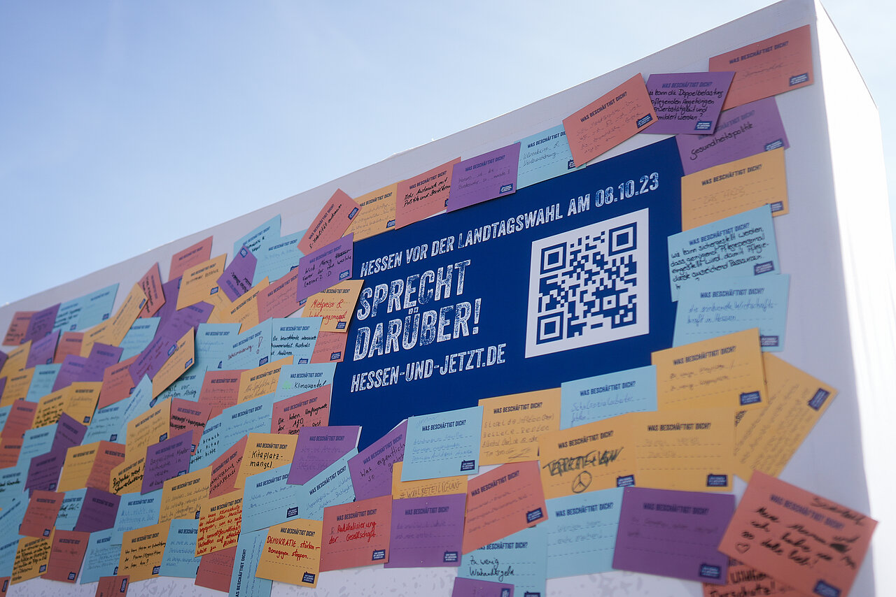 Am Samstag war es so weit – eure Gedanken zur Landtagswahl am 08. Oktober prominent auf der großen Leinwand mitten in Wiesbaden: Aus den vielen Postkarten mit euren Themen, Wünschen, Fragen und Anregungen zur Landtagswahl wurde ein großes Kunstwerk. Wie findet ihr das Ergebnis?