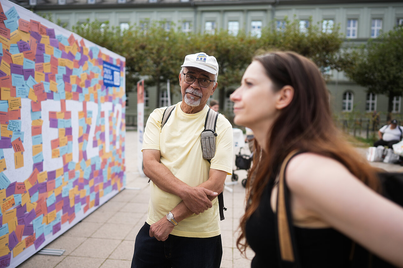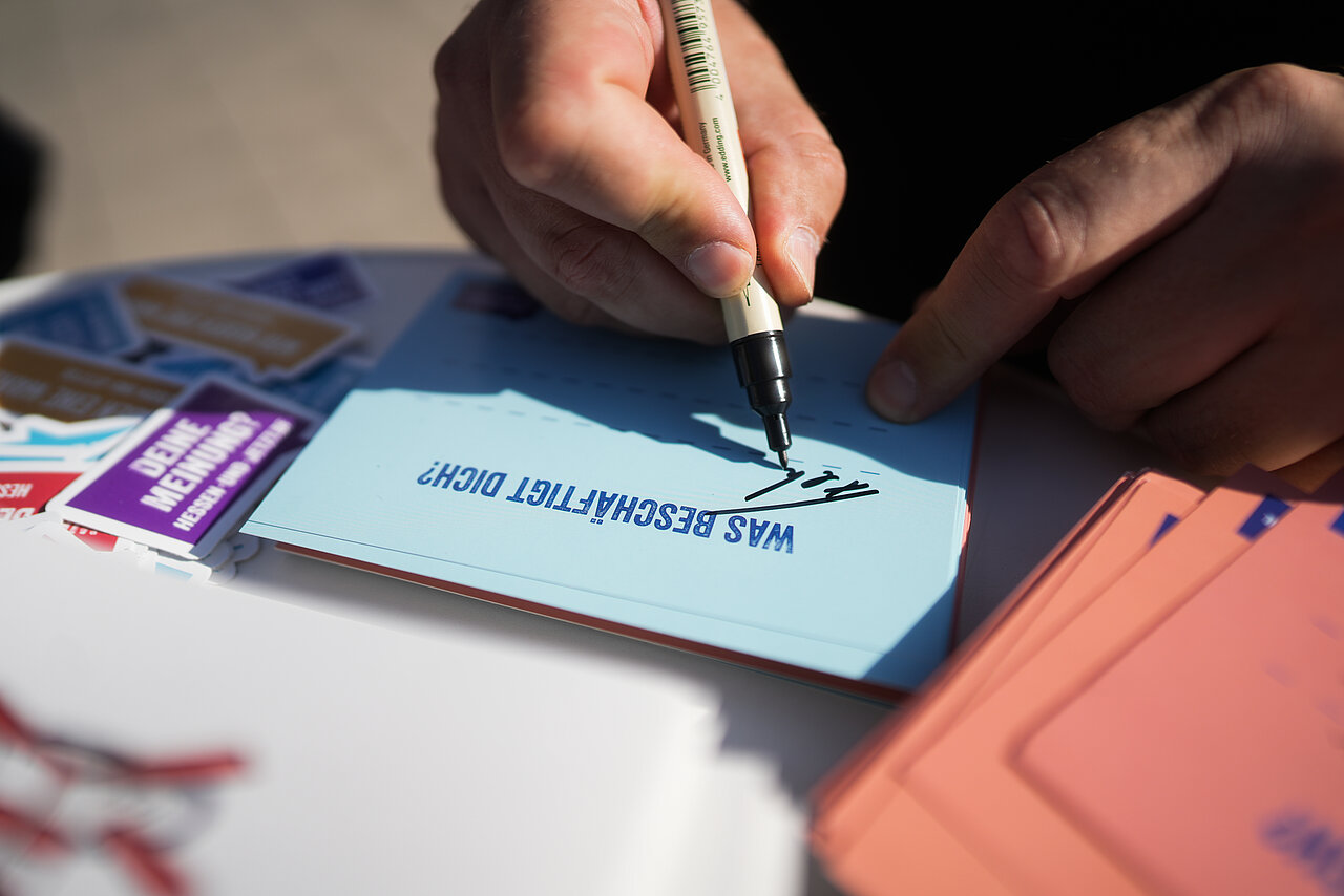Am Samstag war es so weit - eure Gedanken zur Landtagswahl am 08. Oktober prominent auf der großen Leinwand: Aus den vielen Postkarten mit euren Themen, Wünschen, Fragen und Anregungen zur Landtagswahl wurde ein großes Kunstwerk. Wie findet ihr das Ergebnis?